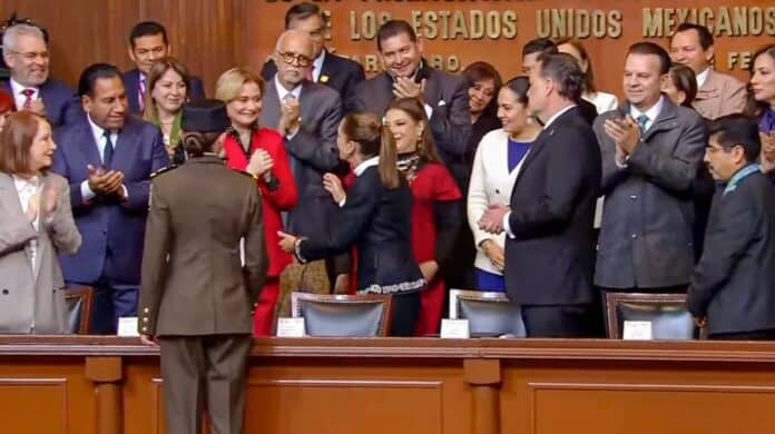 Junto con autoridades del Gobierno Federal, mandatarios estatales y representantes de instituciones legislativas y judiciales del país, la mandataria se dio cita en el Teatro de la República para estar presente en el acto cívico.