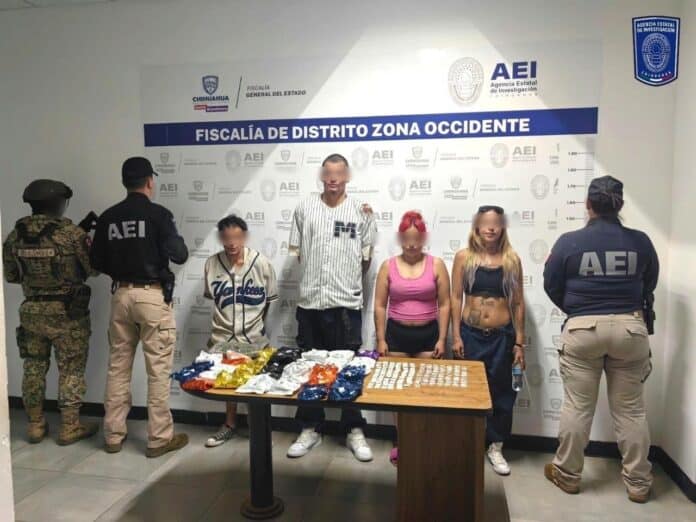 En el lugar se detuvo en flagrancia a: Karina Rubí V. N., de 30 años de edad; Adriana Cretina V. N., de 31 años; Miguel Ángel C. G., de 31 años y Andrés Guadalupe H. B., todos con domicilios en colonia Reforma.