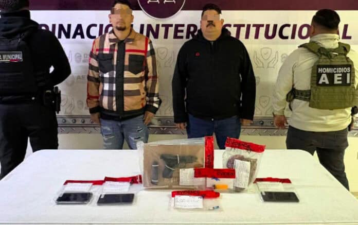 Elementos de la Agencia Estatal de Investigación (AEI), adscritos a la Fiscalía de Distrito Zona Centro, en la ciudad de Chihuahua, detuvieron a dos hombres en flagrancia por delitos contra la salud y por portación de arma de fuego, en la colonia Molino de Agua.