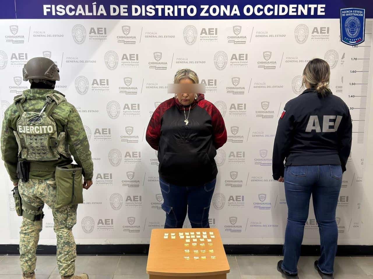 Elementos de la Agencia Estatal de Investigación en conjunto con elementos del Ejército Mexicano, detuvieron a una femenina de nombre Viviana B. L., por posesión de droga en las calles Independencia, entre Agustín Melgar y 3ra., de la ciudad de Cuauhtémoc.