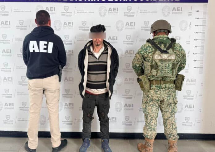 Elementos de la Agencia Estatal de Investigación y del Ejército Mexicano que participan en el Operativo Conjunto implementado en el municipio de Cuauhtémoc, detuvieron en flagrancia a César Alan D. M., en posesión de cristal.