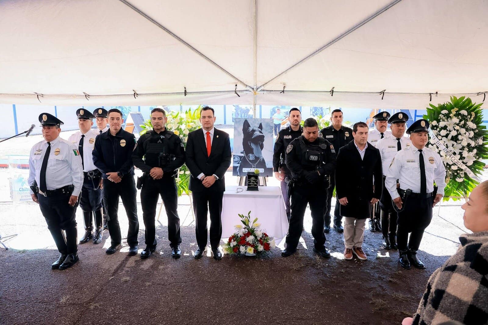 H. Ciudad de Chihuahua, Chih. El alcalde Marco Bonilla, encabezó una guardia de honor para despedir y reconocer el heroísmo de Vico, perro policía que falleció en cumplimiento del deber tras durante un operativo de atención de violencia familiar en un domicilio ubicado “La Cuadrilla” en el Ejido el Fresno.