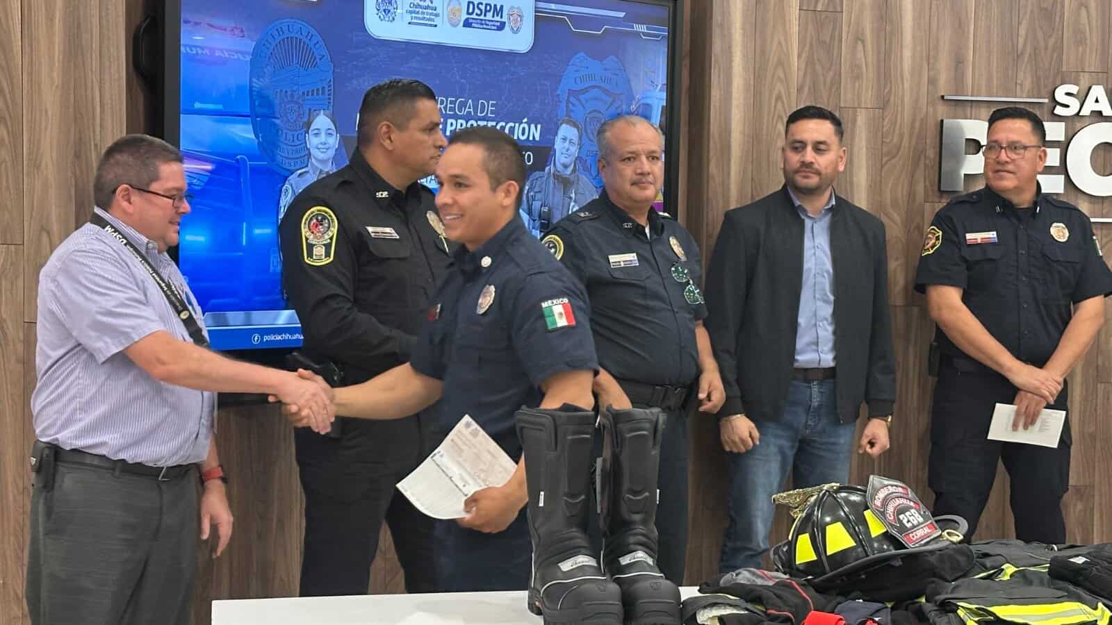 H. Ciudad de Chihuahua, Chih., a 5 de Noviembre del 2025.- La Dirección de Seguridad Pública Municipal, entregó equipos de protección a 33 elementos del H. Cuerpo de Bomberos de la ciudad a fin de brindar las herramientas para seguridad de quienes a diario arriesgan su vida por las y los chihuahuenses.