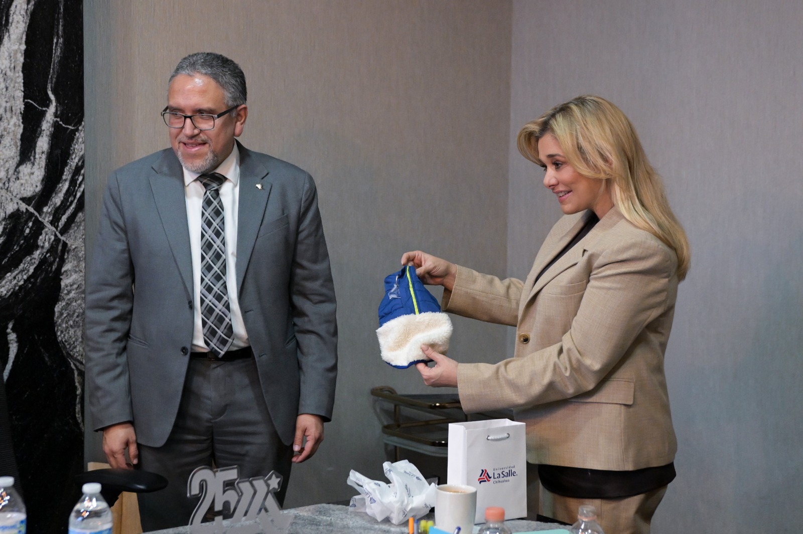 En el marco del encuentro, que la gobernadora Maru Campos sostuvo con miembros del patronato de la Universidad La Salle (ULSA) Chihuahua la mandataria recibió reconocimientos dirigidos a Víctor Cruz y a Guillermo Campos, por su legado que dejaron a la institución.