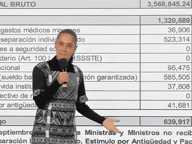 Sin mediar pregunta, la mandataria difundió información que proporcionó el Órgano Administrativo del PJF a la Secretaría de Gobernación, según la cual el aguinaldo de los ministros se redujo de 585 mil a 376 mil pesos y se cancelaron los 36 mil 906 pesos mensuales del seguro de gastos médicos mayores por ministro, el apoyo para alimentos por 5 millones 341 mil y otra partida de un millón 337 mil para gastos de telefonía celular, entre otros.