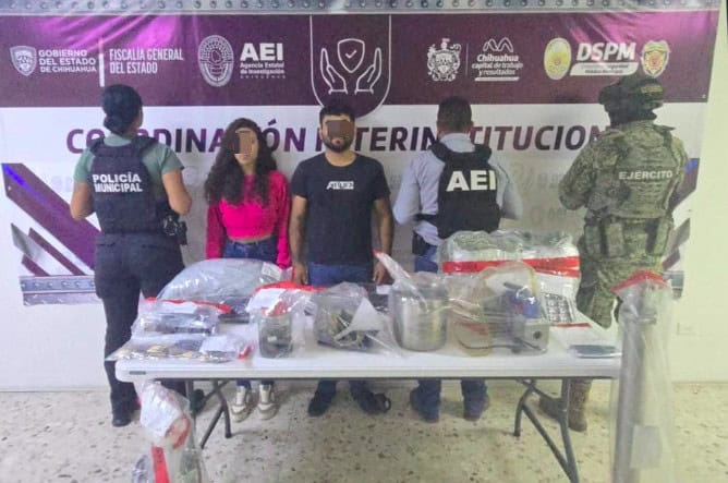 La Unidad Especializada en Investigación de Narcomenudeo de la Fiscalía de Distrito Zona Centro, detuvo a dos personas por posesión de narcóticos, cartuchos y artículos utilizados para procesamiento de estupefacientes, durante el cumplimiento de una orden de cateo en un domicilio de la colonia La Junta, en la ciudad de Chihuahua.