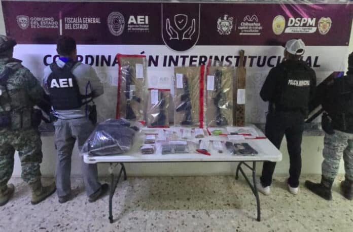 Derivado de labores de inteligencia realizadas en seguimiento de una denuncia ciudadana, elementos de la Agencia Estatal de Investigación (AEI) adscritos a la Fiscalía de Distrito Zona Centro, realizaron un cateo a un domicilio de la calle Lucía, en la colonia Granjas de Sacramento, de la ciudad de Chihuahua, en donde se aseguró diverso arsenal.