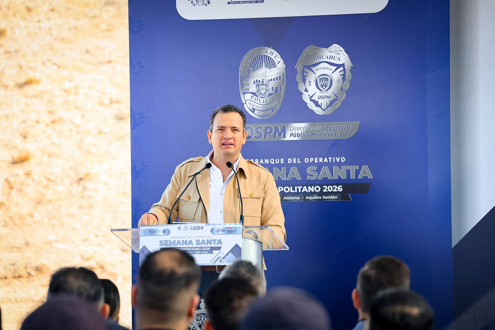 H. Ciudad de Chihuahua, Chih., a marzo de 2026.- El alcalde Marco Bonilla encabezó el arranque del Operativo Metropolitano Semana Santa 2026, en coordinación con los municipios de Aldama y Aquiles Serdán, así como corporaciones de los tres órdenes de gobierno, con el objetivo de garantizar la seguridad de las familias durante el periodo vacacional.