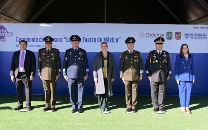 La gobernadora Maru Campos acompañó a las autoridades del Ejército Mexicano, en la ceremonia de clausura de la exposición militar “La Gran Fuerza de México” que se llevó a cabo en la ciudad de Chihuahua.