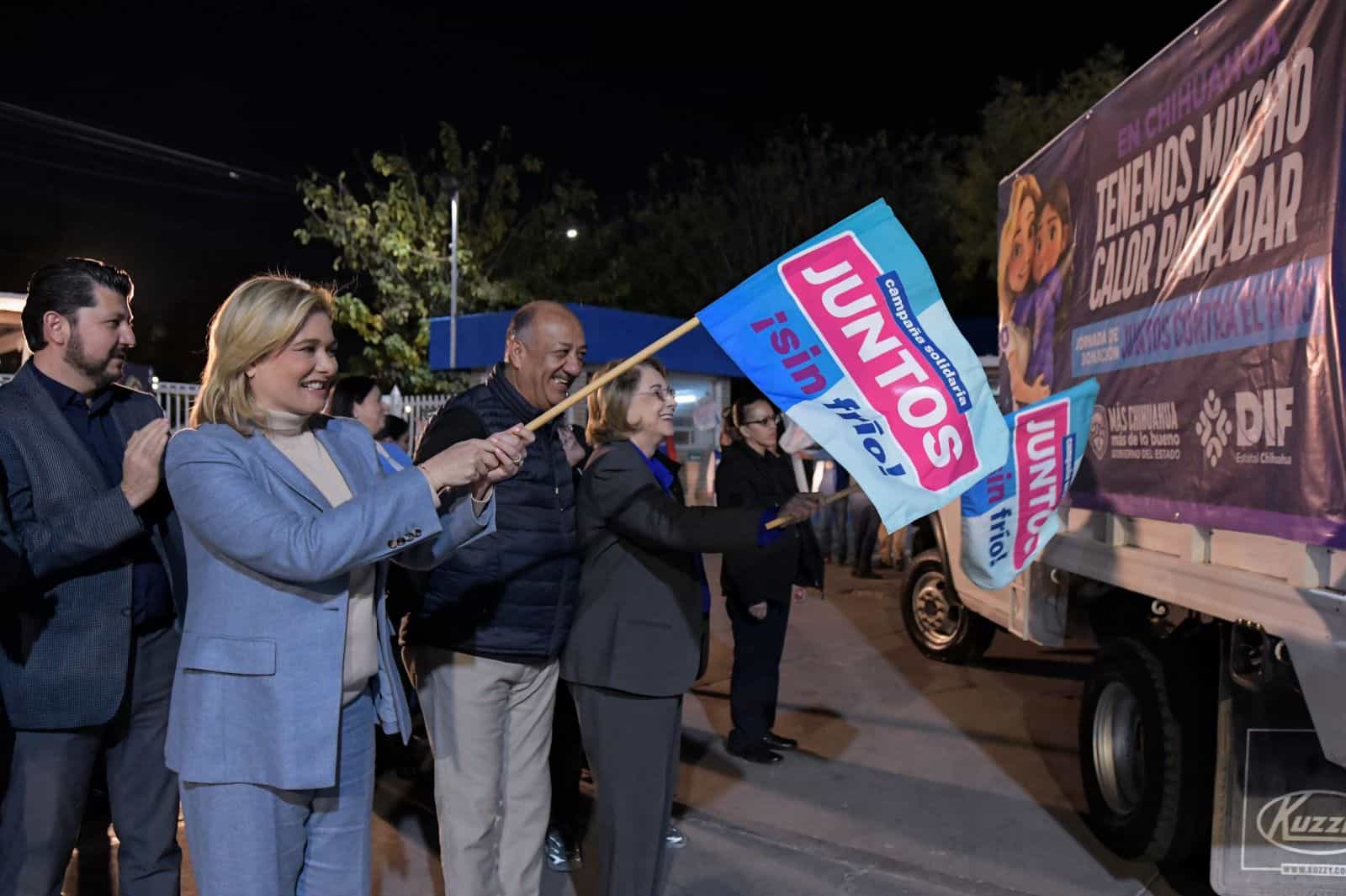 Maru Campos empaquetó las primeras chamarras y acompañó el encendido del camión, que marcó el arranque de la distribución de las prendas hacia diferentes puntos del territorio estatal.