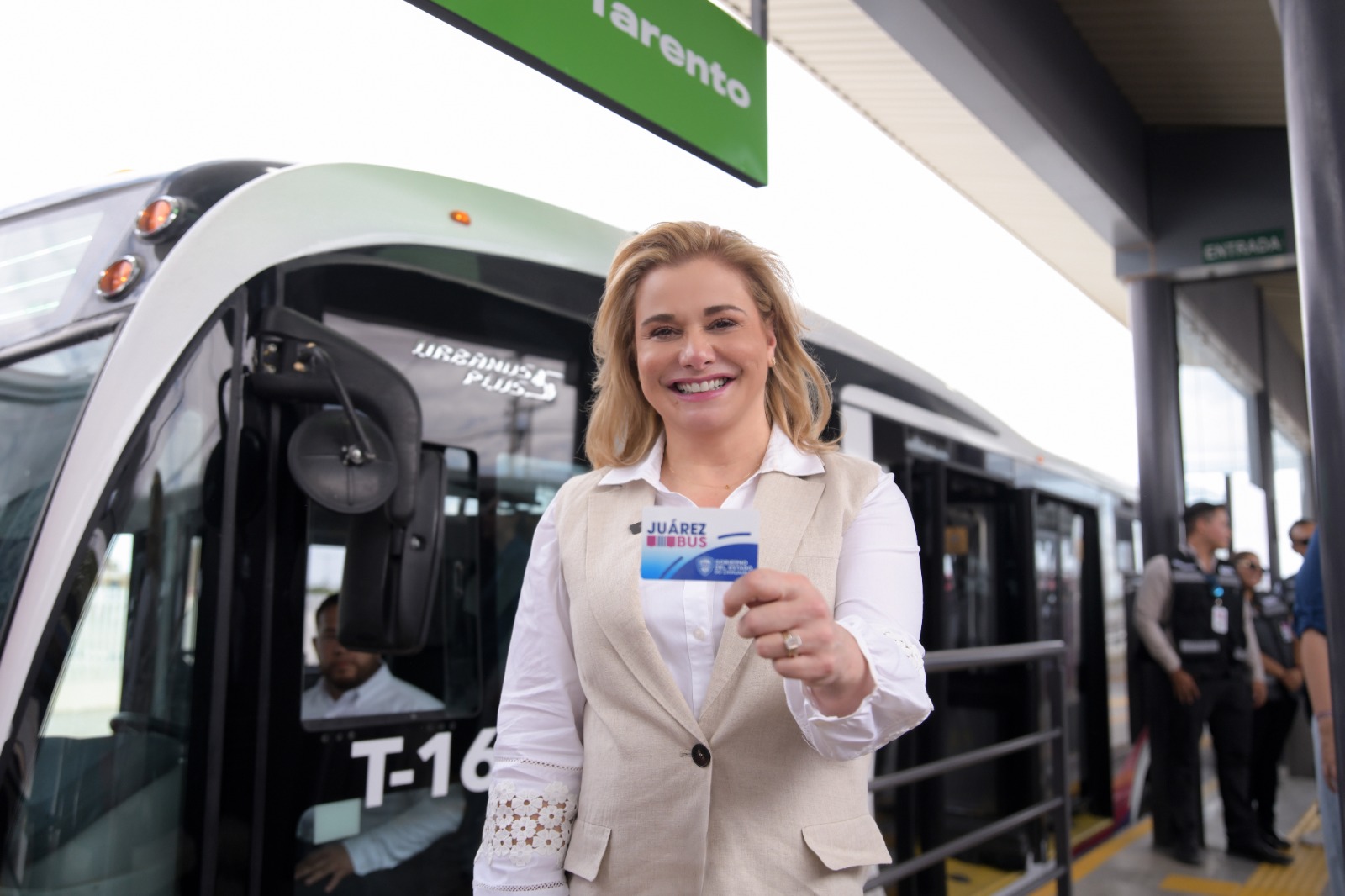 La Gobernadora anunció además que desde hoy, ya se cuenta con una red externa para la compra y recarga de tarjetas generales JuárezBus en 300 tiendas de conveniencia, lo que permite a los usuarios cargar saldo en sus credenciales en puntos fuera del sistema de transporte.