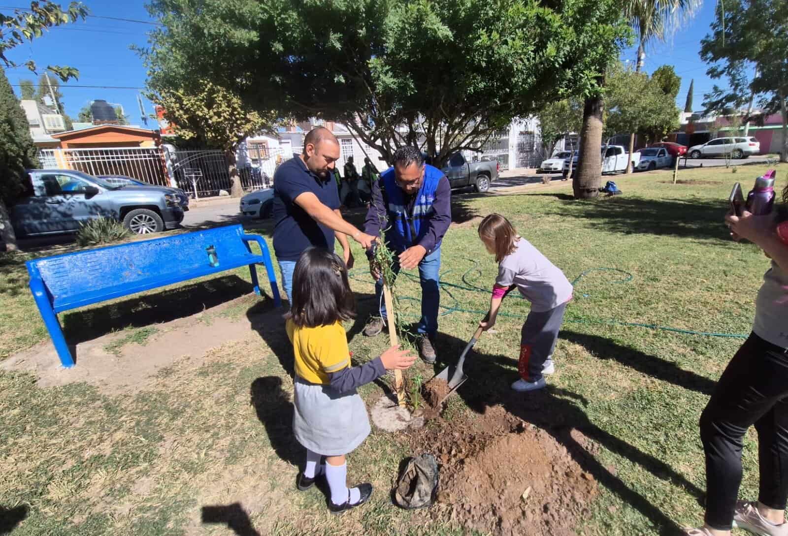 H. Ciudad de Chihuahua, Chih., a 6 de noviembre de 2025.- Las niñas y niños de la escuela Primaria Jesús Reyes Heroles, plantaron junto con personal del Gobierno Municipal y vecinos del sector Alamedas, 20 árboles de especies como encino siempre verde y palo verde en el parque Rafael Muñoz.