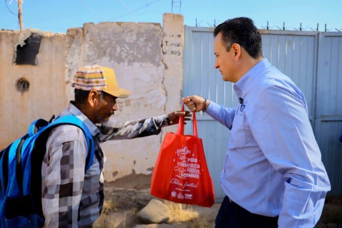 H. Ciudad de Chihuahua, Chih., Como parte del compromiso del DIF Municipal de atender a las familias vulnerables de la ciudad, el alcalde Marco Bonilla y su esposa Karina Olivas, iniciaron con la entrega de cenas navideñas a las familias de la colonia Crucero, al sur de la ciudad.