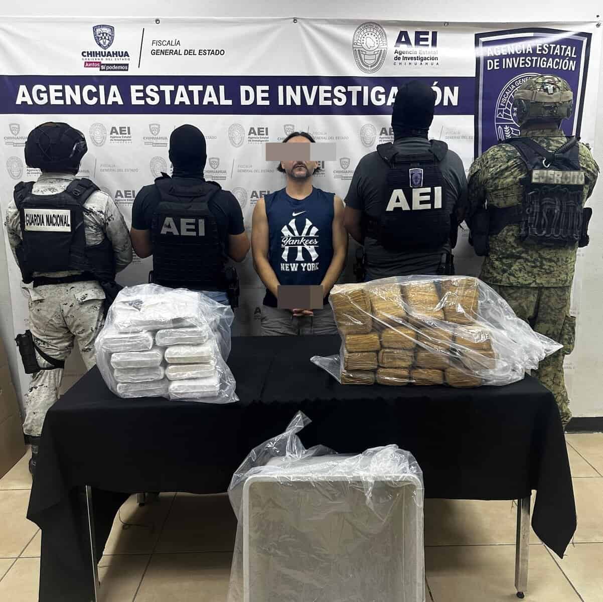 Elementos de la Agencia Estatal de Investigación, con apoyo de la Guardia Nacional y del Ejército Mexicano, detuvieron a un masculino que se identificó como Daniel Guillermo S. B., por su presunta responsabilidad en delitos contra la salud, cometido en Ciudad Juárez.